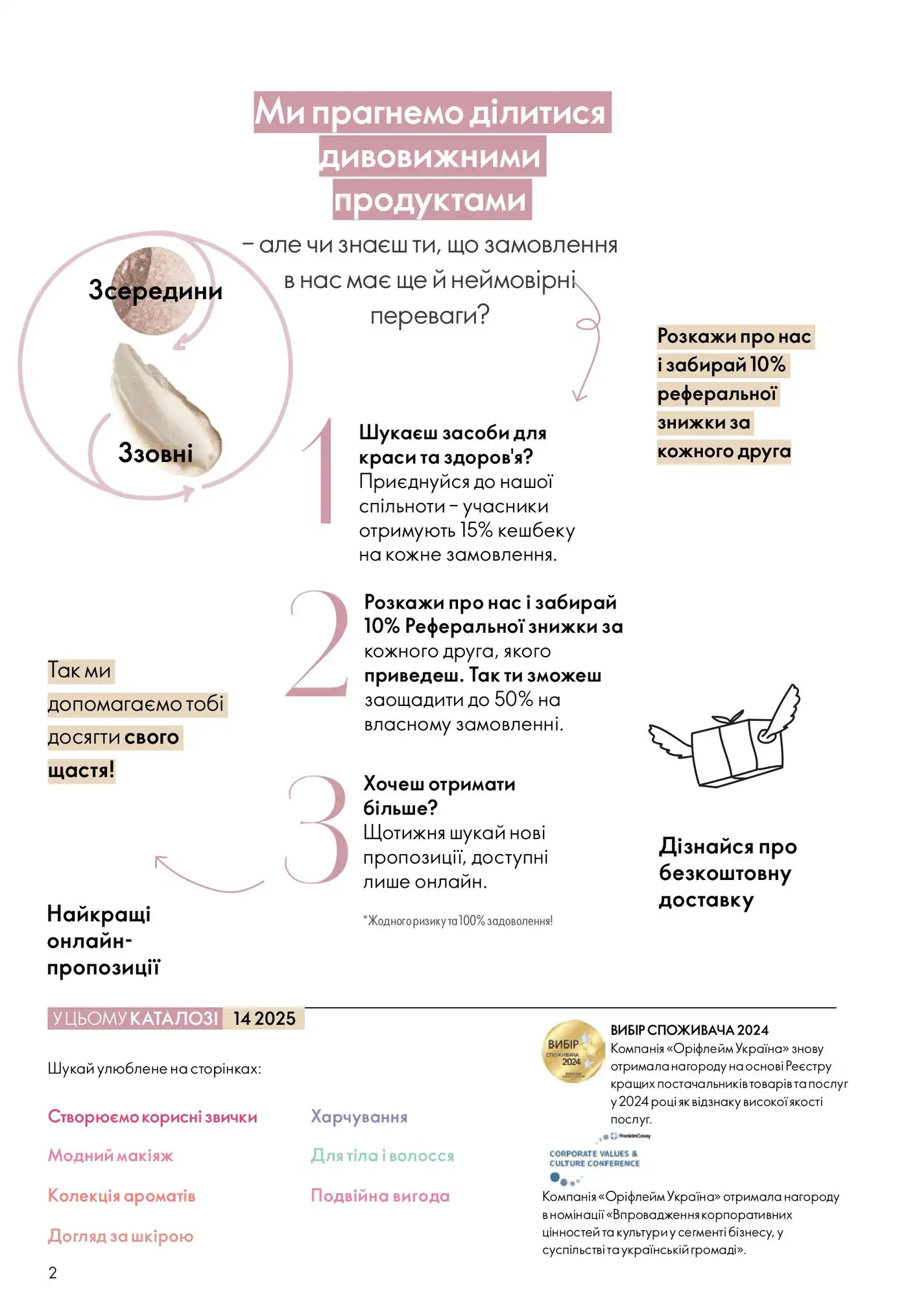 Действующий каталог Oriflame № 14 2025 Украина, доступный для онлайн просмотра с 5 по 25 октября 2025 года. Цены указаны в гривнах. Зарегистрируйтесь в Орифлейм Украина, чтобы приобретать косметику со скидкой 20% — это просто и выгодно!